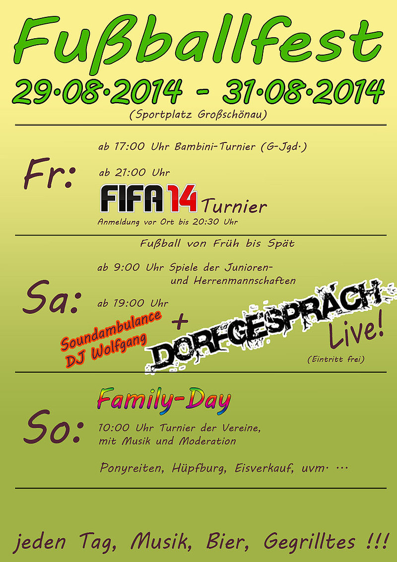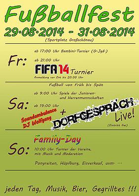 Das Fussballfest 2014 in Großschönau findet vom 29.-31.08. statt. Informationen anbei...