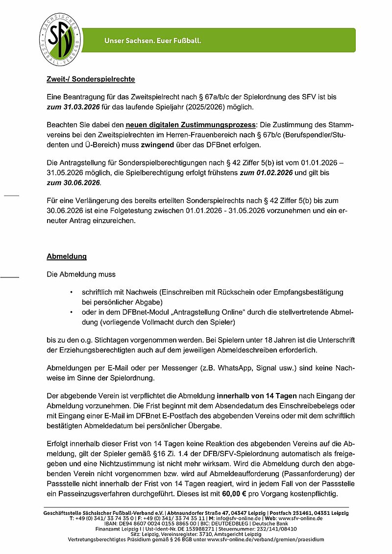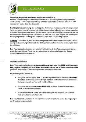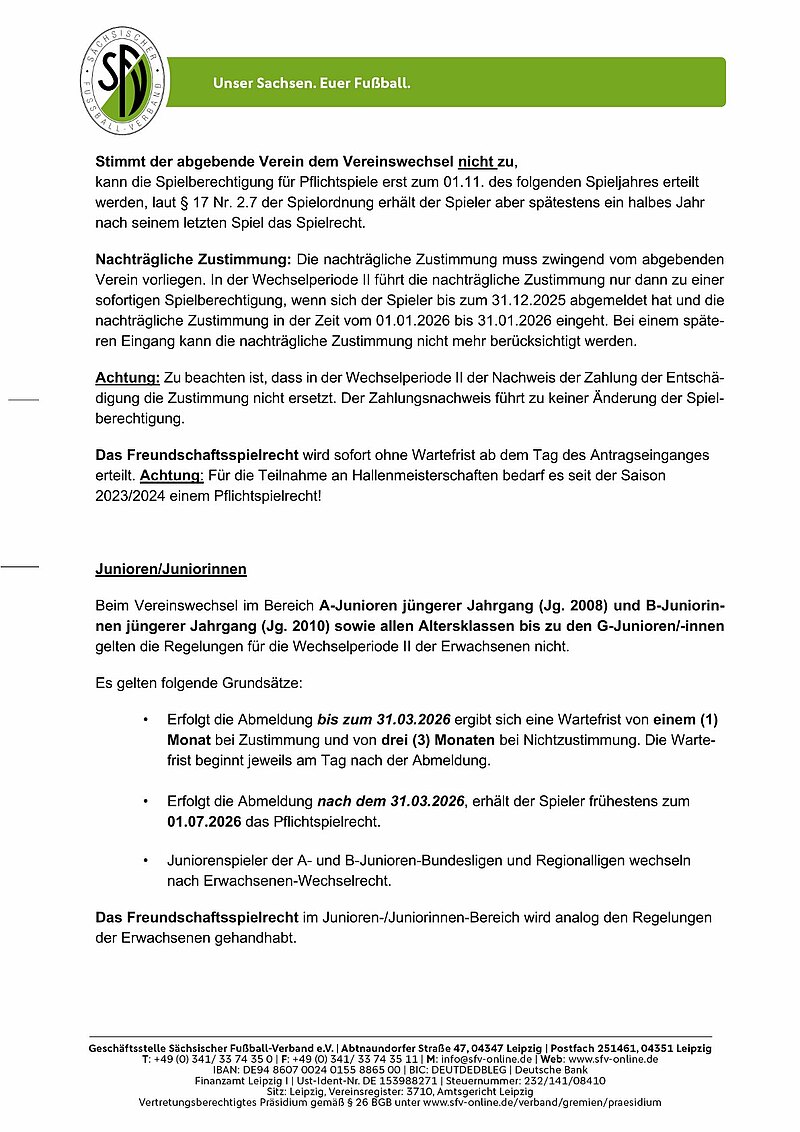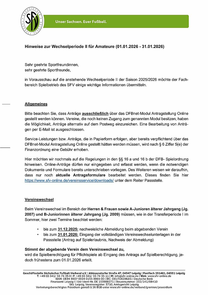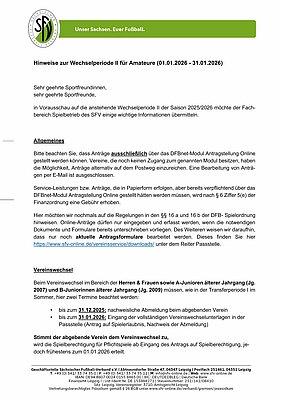 Der SFV möchte im Hinblick auf die bevorstehende Wechselperiode II der Saison 2025/2026 wichtige Informationen übermitteln: