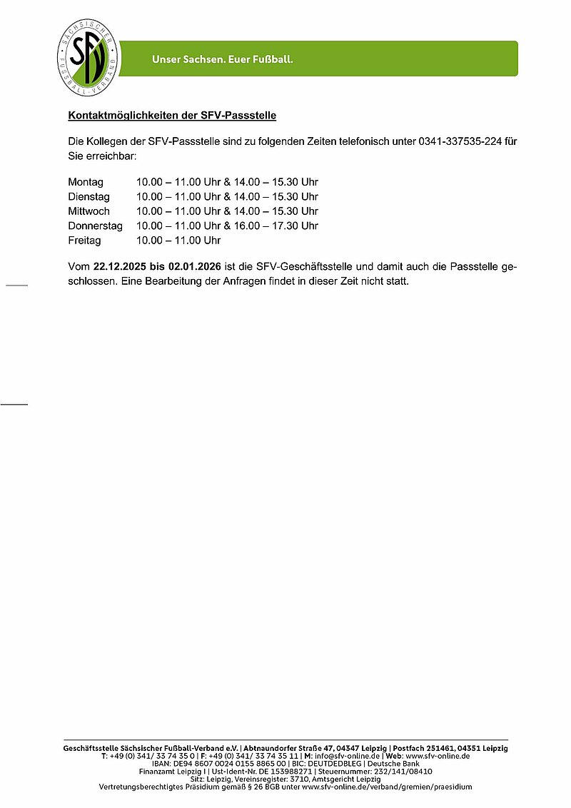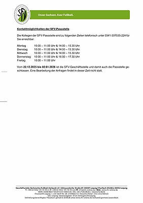 Bitte beachtet, dass die Geschäftsstelle des SFV vom 22.12.2025 bis 02.01.2026 geschlossen ist.