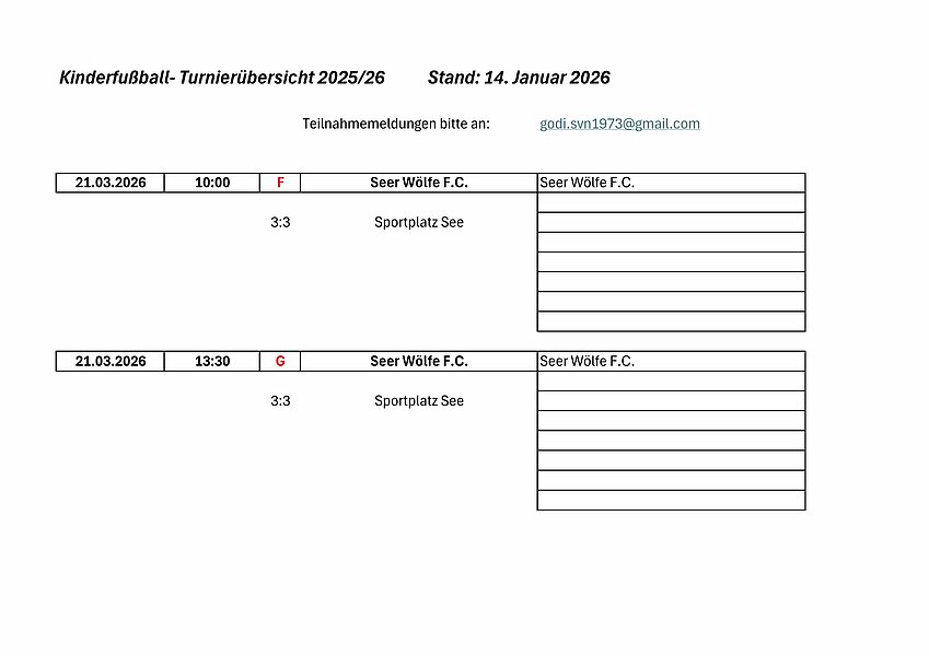 Der DFB und wir als Jugendausschuss haben bisher vorgegeben, wie die Turniere stattfinden sollen. Daran soll sich eigentlich auch nicht ändern, aber es ist jeweils dem Gastgeber überlassen, in welcher Form das Turnier stattfinden soll. Anzugeben bei der Anmeldung sind der Termin, der Turnierbeginn und der Spielort, dazu können die Vordrucke verwendet werden, dies kann aber auch formlos erfolgen.